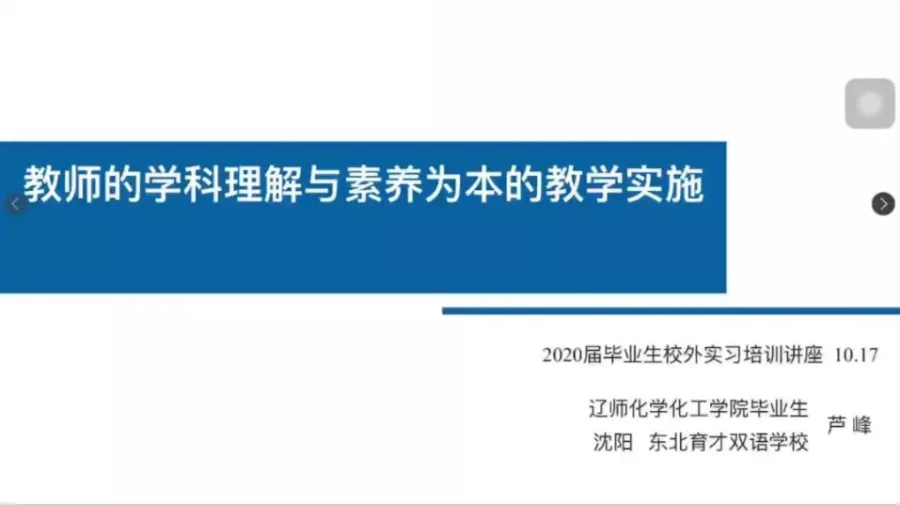 于10月17日晚借助腾讯会议平台开展师范生“一践行三学会”主题系列报告会第二讲。本次报告的题目为“教师的学科理解与素养为本的教学实施”,主讲人为东北育才双语学校教师芦峰。出席本次报告的领导及嘉宾有学院教学院长金晶、化学(师范)专业负责人杨梅、化学教育研究所所长王秋、功能材料化学研究所单文娟、无机化学研究所朱江、物理化学研究所杨永彪、化学教育研究所黄翠英、李书实、王立新及2017级、2018级本科师范生及学科教学(化学)专业研究生。本次报告会由学院化学教育研究所所长王秋主持。