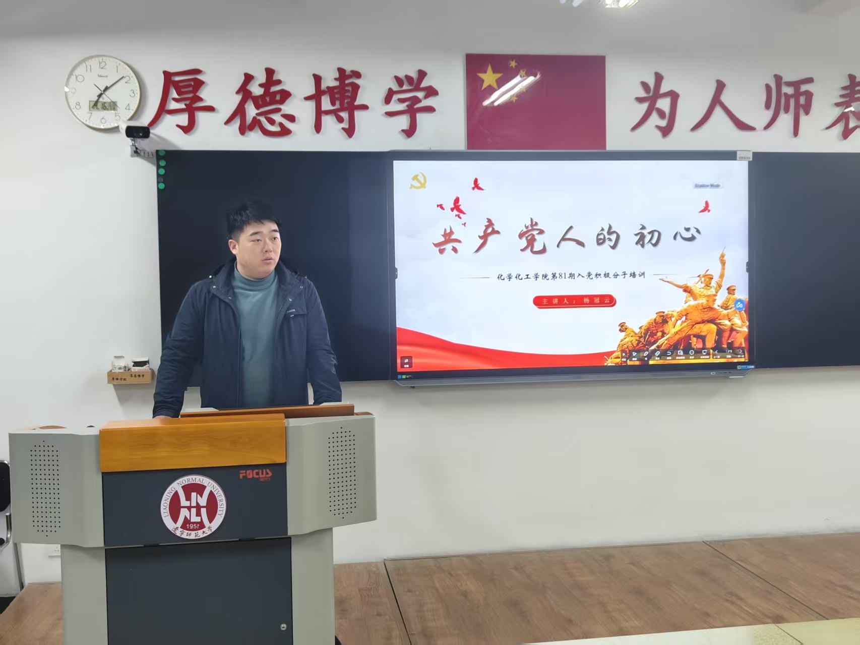 于理化楼C416组织开展第81期入党积极分子培训第二讲。本次培训由本科生党支部书记杨冠云老师主讲,主题为“共产党人的初心”。