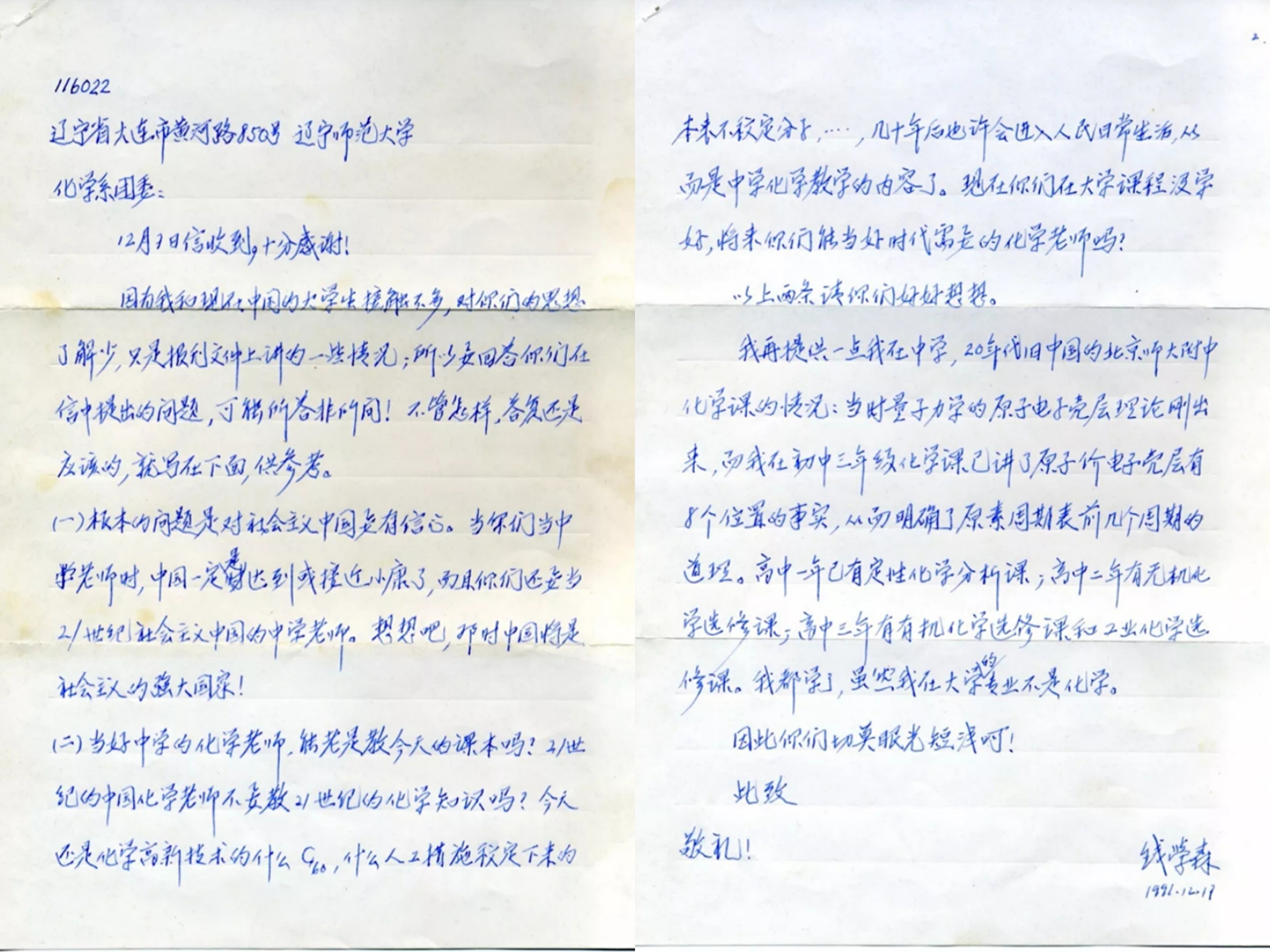 1991年12月,正值我国航天事业奠基人、杰出科学家钱学森先生八十寿辰,时任辽宁师范大学化学系团委书记靳国卫提议,化学系学生会同学执笔,就如何树立正确的理想信念、毕业后如何更好地从事中学教师工作以及如何搞好今天的学习等问题向钱老致信。10天后,钱老亲笔为化学系青年师生写了复信。复信中,钱老明确指出,要对社会主义中国有信心,为当好21世纪的中国化学老师做准备,切莫眼光短浅。