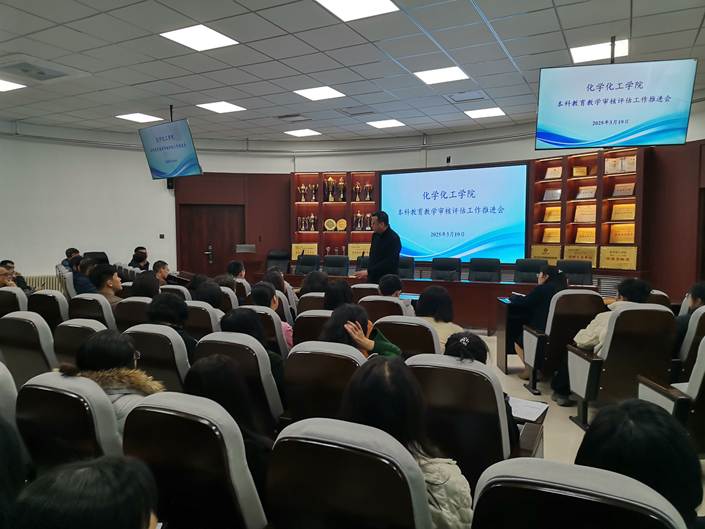 宫利东院长在动员讲话中强调,本轮审核评估不仅是对学院人才培养质量的全面检验,更是推动学院内涵式发展的重要契机。他就做好迎评工作提出三点要求:一是要提高政治站位,深刻认识审核评估对学院长远发展的重要意义;二是要严格对标评估标准,将评建要求融入日常教育教学全过程;三是要强化责任担当,建立健全“全员参与”的工作机制,确保各项任务落实落细。宫院长在总结中特别强调,要将审核评估与主题教育有机结合,坚持问题导向,建立持续改进机制。他号召全院教师以高度的责任感和使命感,凝心聚力,高质量完成审核评估各项工作,为推进学院化学学科建设再上新台阶贡献力量。