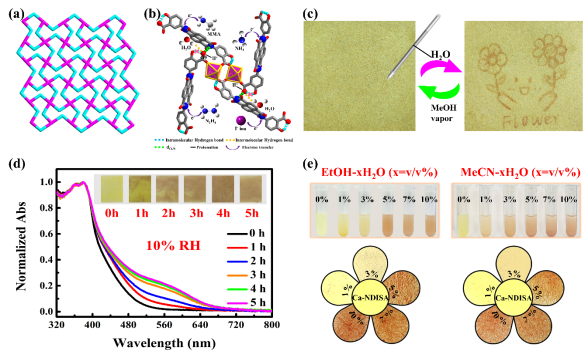 图2 (a) Ca-NDISA的结构;(b)多重刺激响应电子转移路径;(c-e)水致变色材料的应用:成像;湿度传感器;有机溶剂中水含量检测