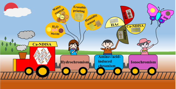 刺激响应型金属有机框架材料在信息存储、防伪及污染物监控等前沿领域具有广泛的应用前景。然而,精确调控分子结构,合成高效刺激响应材料仍然存在诸多挑战。为此,本研究利用N,N’双(3-羧基-4-羟基苯基)-1, 4, 5, 8-萘二酰亚胺(H4NDISA)配体,设计、制备了一种具有丰富开放活性位点的碱土基二维材料Ca-NDISA,通过不同的电子转移途径识别多种特定的外部刺激,实现了多重刺激响应变色应用。Ca-NDISA是由Ca2+和部分去质子化的H4NDISA自组装形成的二维网络结构,其中包含未配位的羟基以及具有缺电子性质的NDI单元。Ca-NDISA在水、酸、小分子胺、卤素阴离子等多种刺激下能够显示出不同的颜色变化。在水致变色实验中,Ca-NDISA可以从黄色变为红色,并能够实现有机溶剂中水含量的快速检测(检测限低至3% v/v)。在胺/酸致变色实验中,Ca-NDISA在强酸蒸汽中变为红色,而在小分子胺(NH3∙H2O, N2H4∙H2O, MMA)蒸汽中变为棕色,因此可实现胺/酸的可视化区分。在阴离子致变色中,Ca-NDISA对I⁻呈特异性响应,颜色从黄色变为黑褐色。理论计算和UV-vis、EPR、XPS等分析测试手段表明,被检测物质与Ca-NDISA之间存在氢键、主客体等相互作用,而不同颜色变化行为源于不同电子转移途径引起的NDI自由基的形成。此外,制备的PMMA@Ca-NDISA复合膜材料兼具高机械强度和便携性,可用于可擦写水印纸、湿度传感及胺/酸蒸汽的检测,丰富了可用于实际应用的多功能变色材料,为开发可视化便携识别检测器提供了理论和技术支持。