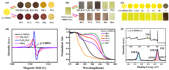 图3 (a)胺/酸致变色;(b)复合膜作为胺/酸识别检测器;(c)阴离子致变色;(d-f)多重刺激响应变色机制:EPR光谱;UV-vis光谱;XPS光谱